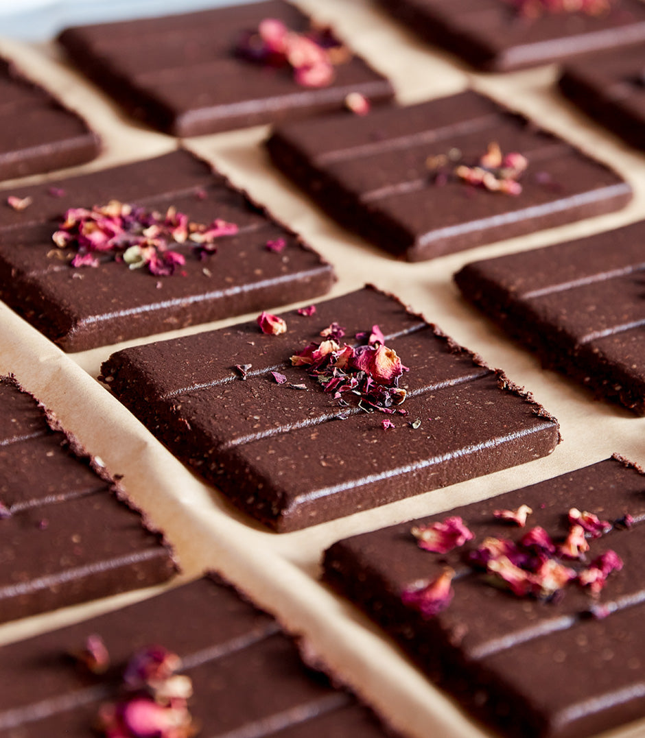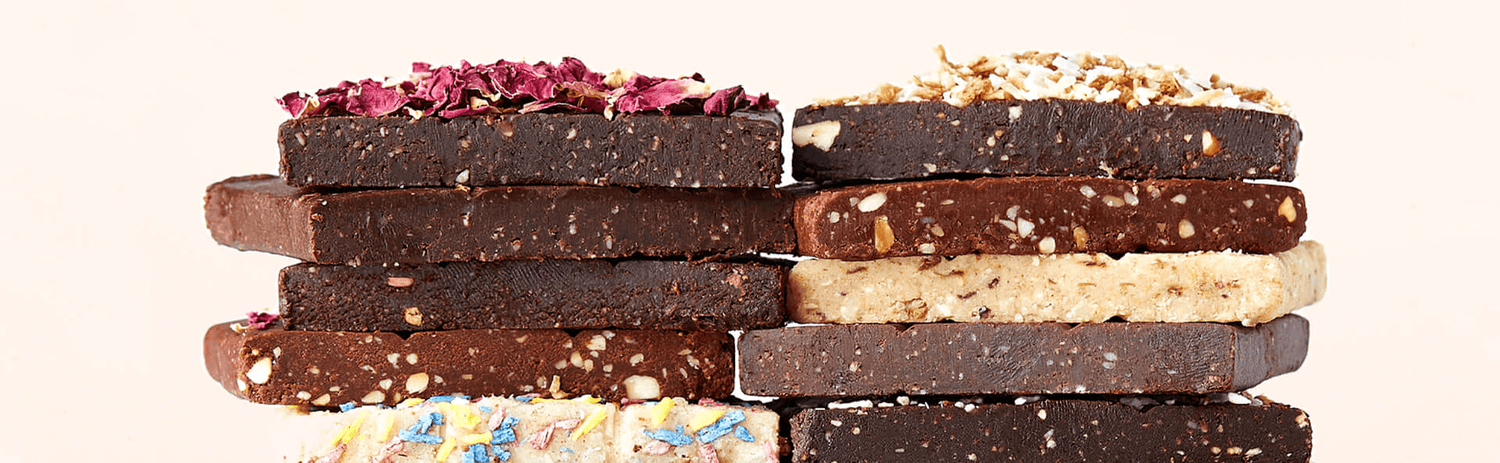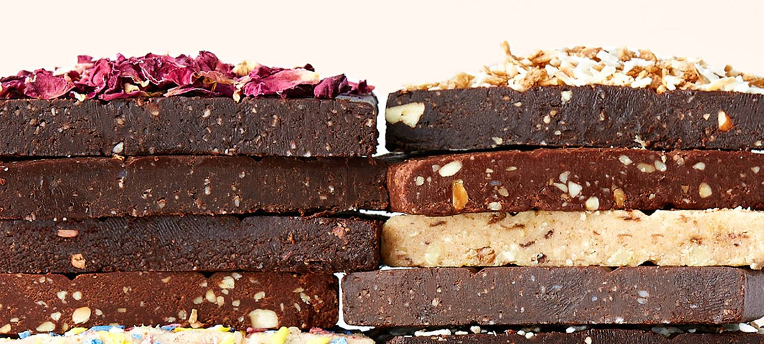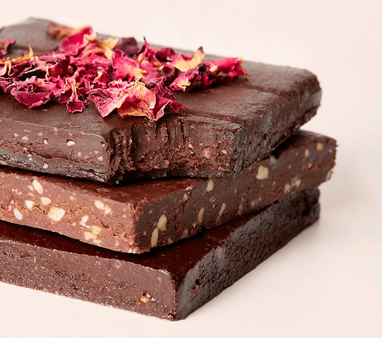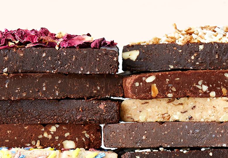 The texture of our bars is like that of brownie batter, chocolate truffles, fudge – the real treat is learning they’re made with organic whole foods naturally free from refined sugar, dairy, gluten, and soy.